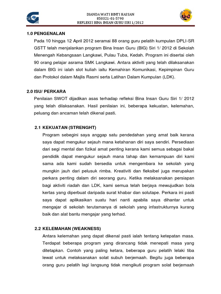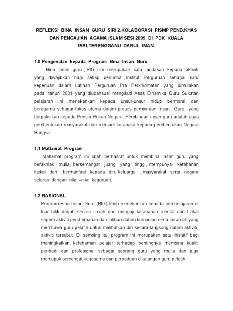 Dalam postingan kali ini, penulis termotivasi kembali untuk mengajak para insan pendidik, guru dan dosen untuk komitmen menjalankan proses refleksi ini. Download bina insan guru download document. Laporan aktiviti perkhemahan bina insan guru 2012aaaa. Refleksi program bina insan guru big. Memperkembangkan potensi sebagai insan melalui pembinaan portfolio dengan mengamalkan refleksi dan penilaian kendiri dalam semua aspek tugas.
